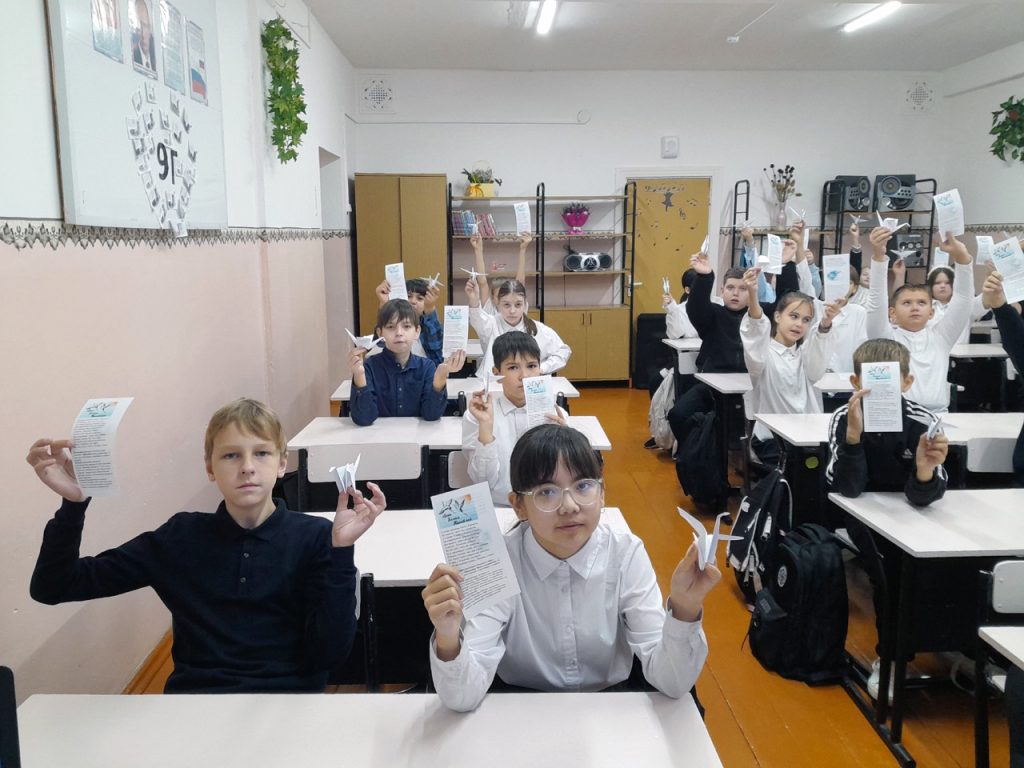 Ребята узнали, почему именно журавли стали символом, и услышали трогательную историю японской девочки Садако Сасаки. На встрече звучала знаменитая песня «Журавли».