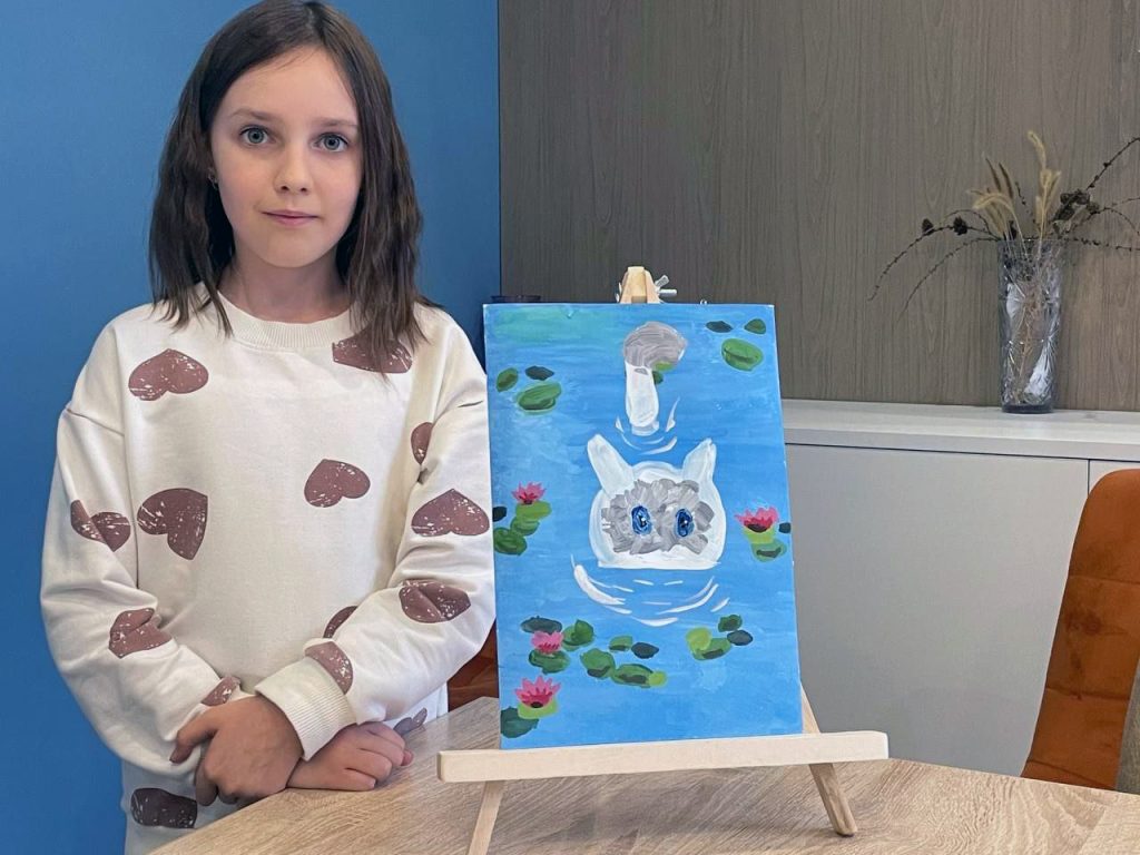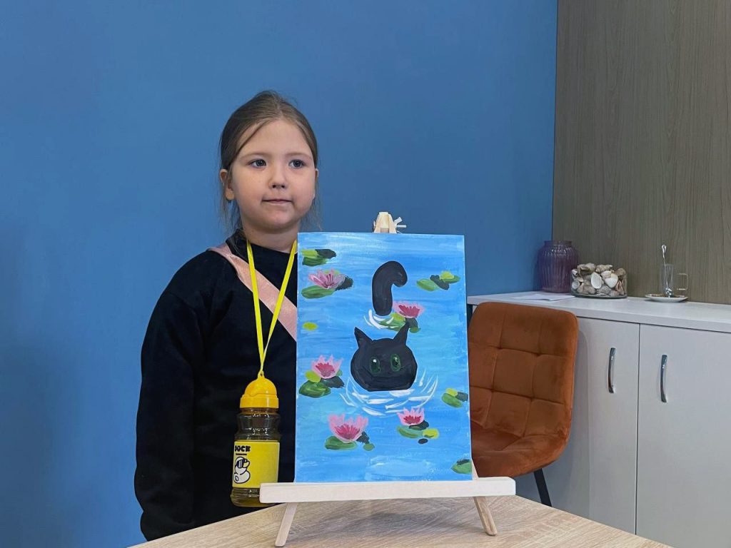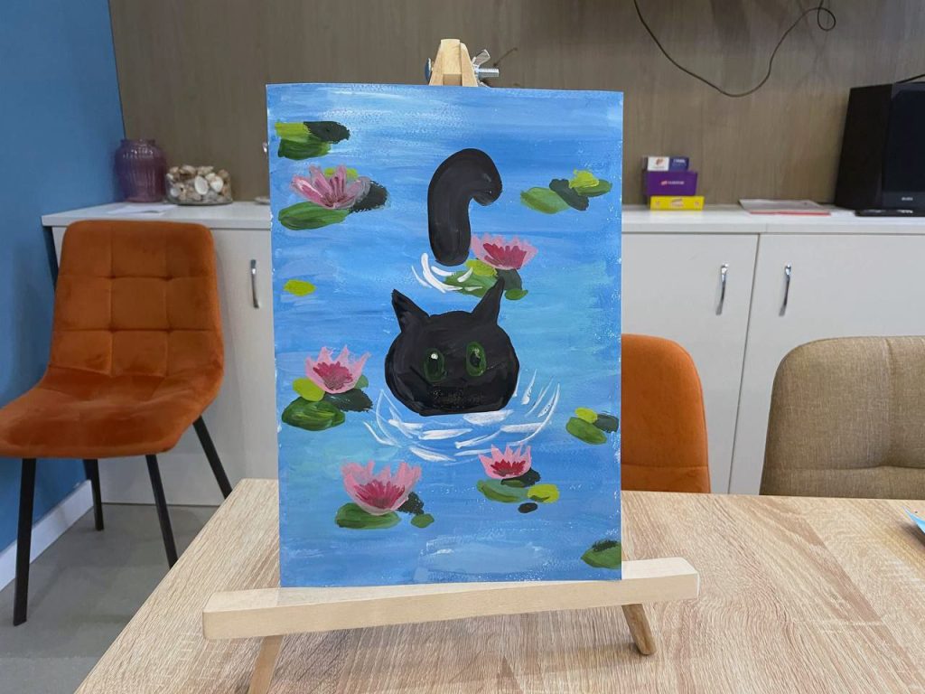 Сначала ребята с помощью мазков на бумаге «залили» фон будущей картины, затем придали ей деталей в виде кувшинок, а потом приступили к главному герою изображения — коту. И каждый смог изобразить своего домашнего питомца, подобрав цвета для нужного окраса!
