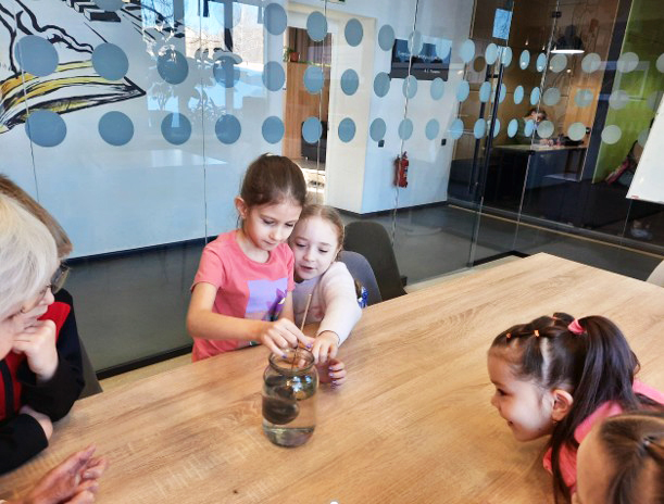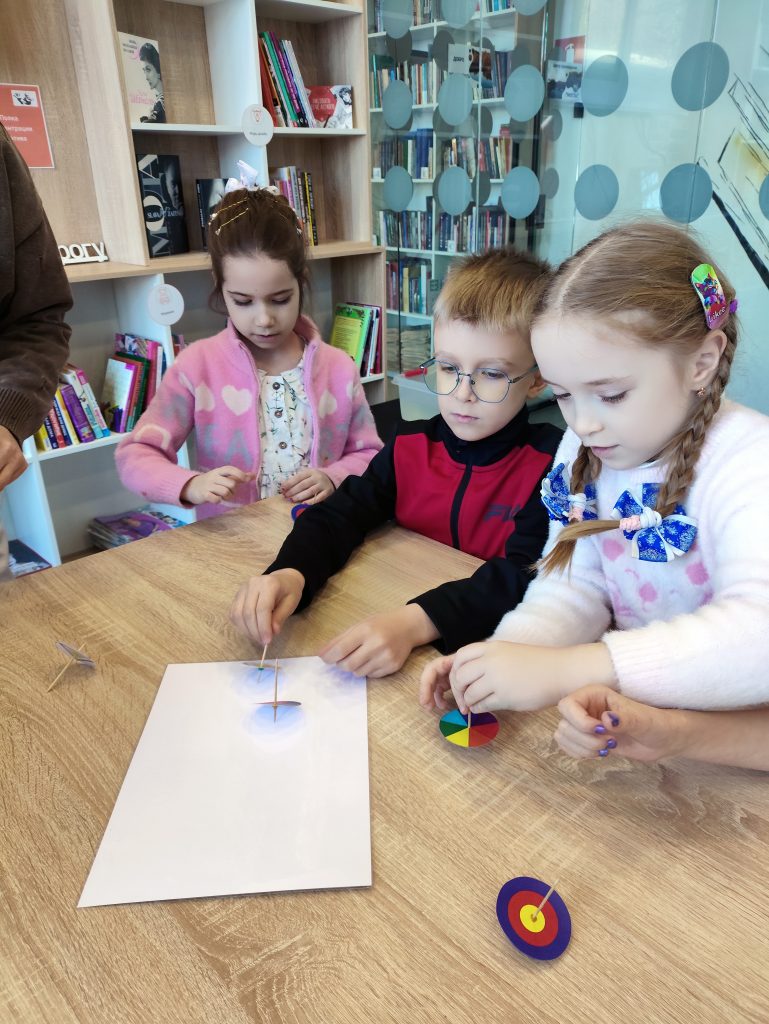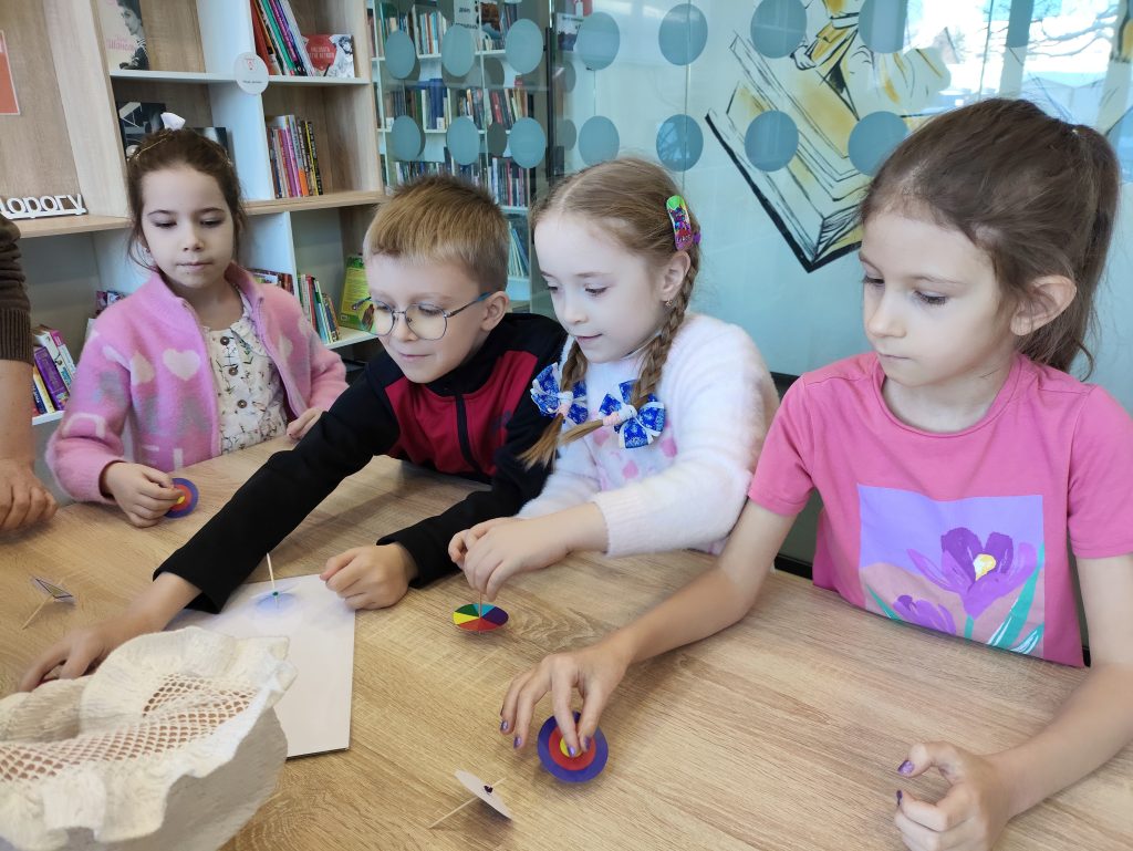 В конце занятия ребята получили в подарок тауматроп — оптическую игрушку с двумя картинками на карандаше, а также разноцветные волчки.