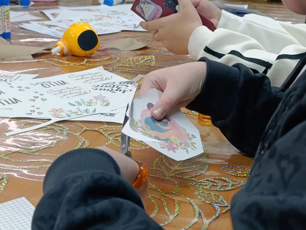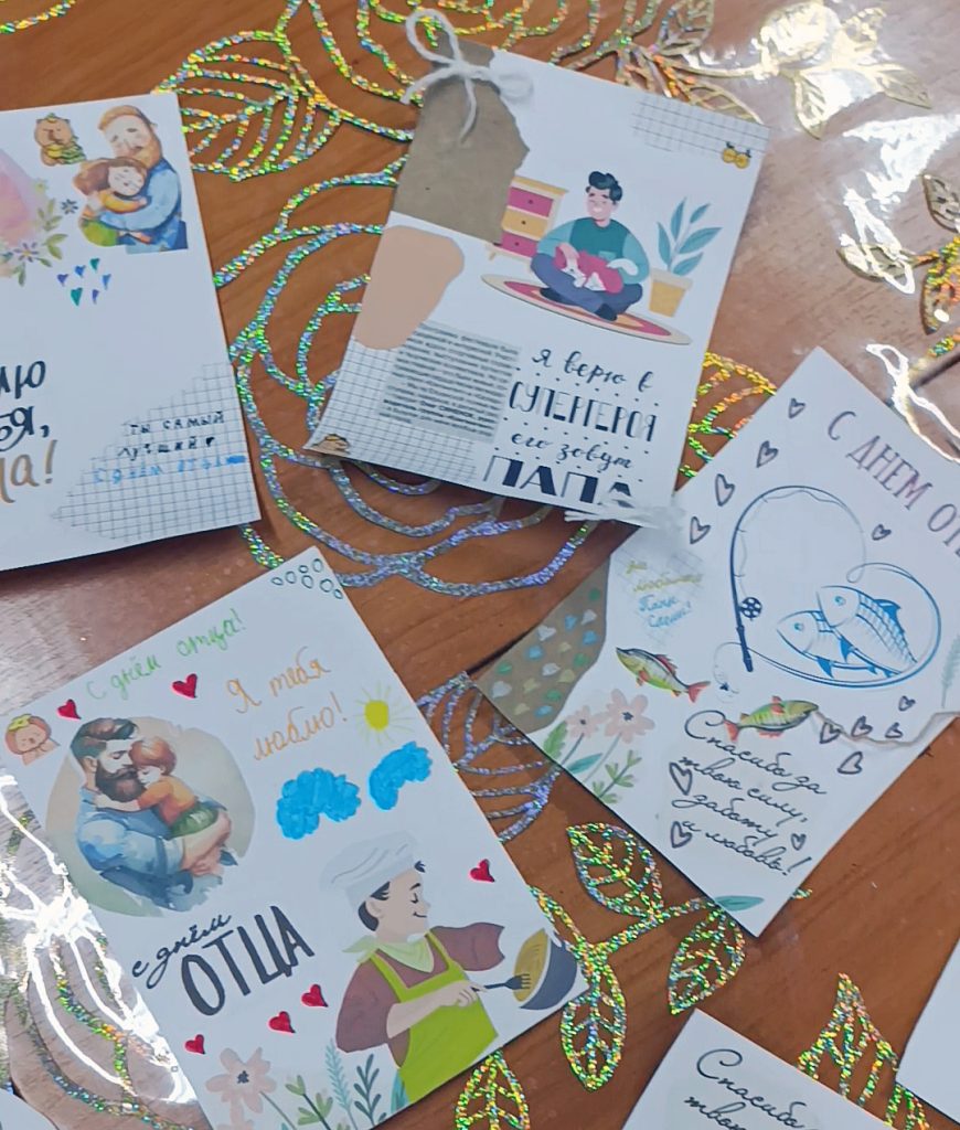 В рамках мероприятия участники познакомились с техникой создания поздравительных открыток. В процессе мастер-класса ребята использовали заготовленные картинки с изображениями отцов и детей, а также поздравительные надписи и пожелания. Для оформления открыток применялись яркие фрагменты бумаги различных цветов, что позволило каждому участнику проявить свою творческую фантазию и индивидуальность.